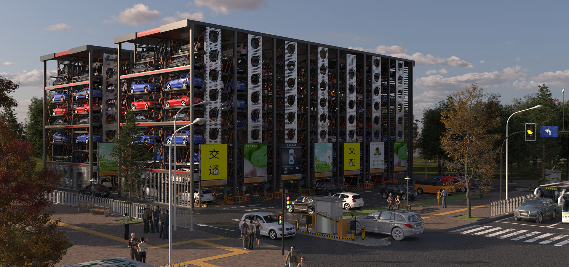 垂直平面內配置的多個載車板以循環(huán)運動的方式進行存取汽車,設計靈感來自游樂園里的摩天輪,車輛像游客坐在摩天輪的吊籃里。當所需存取汽車的載車板按順/逆時針方向(就近方向)循環(huán)運動至車庫出入口時,駕駛員進入車庫將汽車存入或取出完成存取過程。多用于醫(yī)院、酒店、商場等進出車集中的場所。