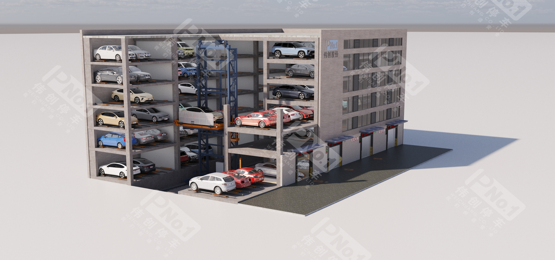 偉創(chuàng)巷道堆垛類機械停車設(shè)備采用先進的計算機控制,是一種集機、光、電、自動控制為一體的全自動化機械式停車設(shè)備。使用堆垛機將汽車水平且垂直移動到停車位旁,并運用梳齒式搬運器或堆垛機上的存取機構(gòu)將汽車存入,反之取出。